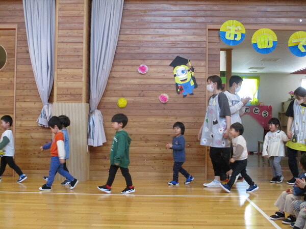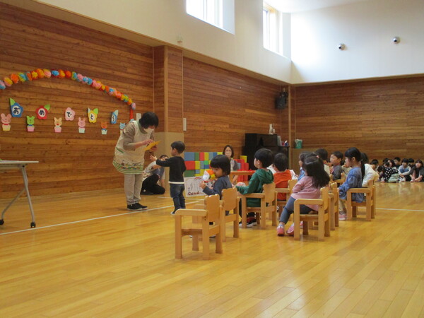| 2歳児のミニ卒園式がありました。 0歳から5歳児のお友だちに見守られて素敵な卒園式ができました。 証書もお花も全て先生の手作りです。 みんな、素敵な3歳児に進級します。 |