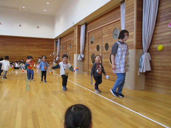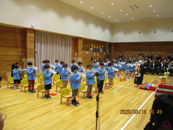 | 3月2日に年長組のお別れ会がありました。 ストレッチや鍵盤ハーモニカ、ベルの発表などしました。 インフルエンザの流行でお休みがおおかったのですが、登園したお友だちでがんばりました。 お休みしたお友だちは後日発表の機会を持ちます。 |